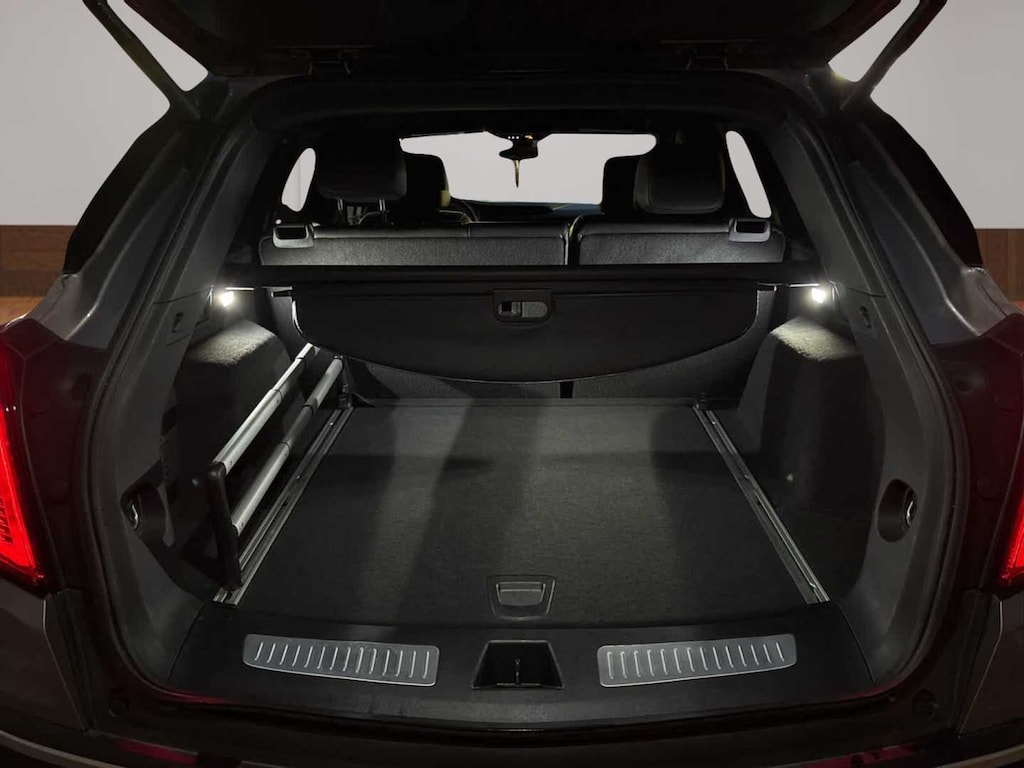 - Opens or closes when the system senses the key fob and the driver extends their foot under the left-hand side of the rear bumper over an image of the Cadillac Crest projected under the vehicle